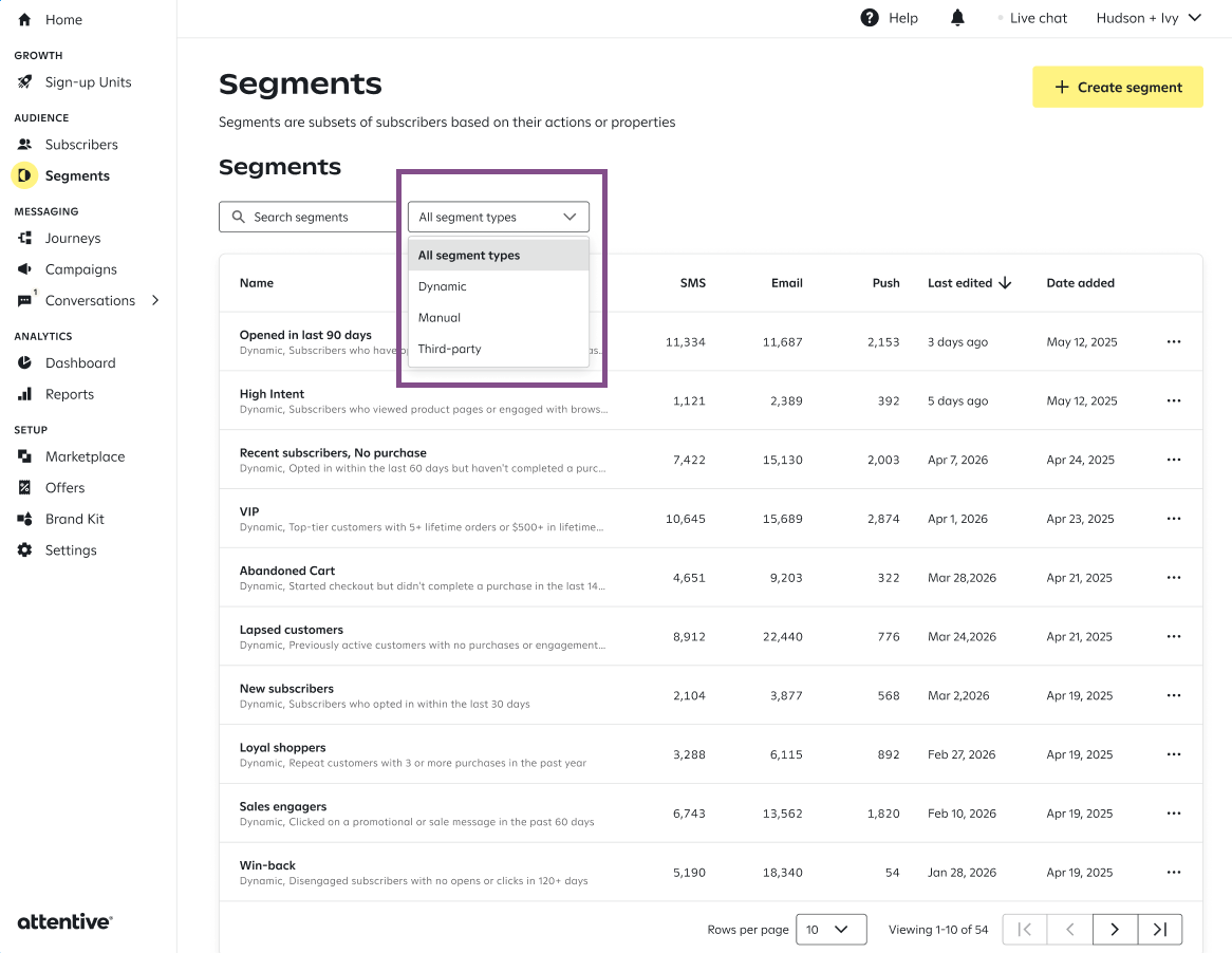- Click the name of the segment you want to import into Attentive.