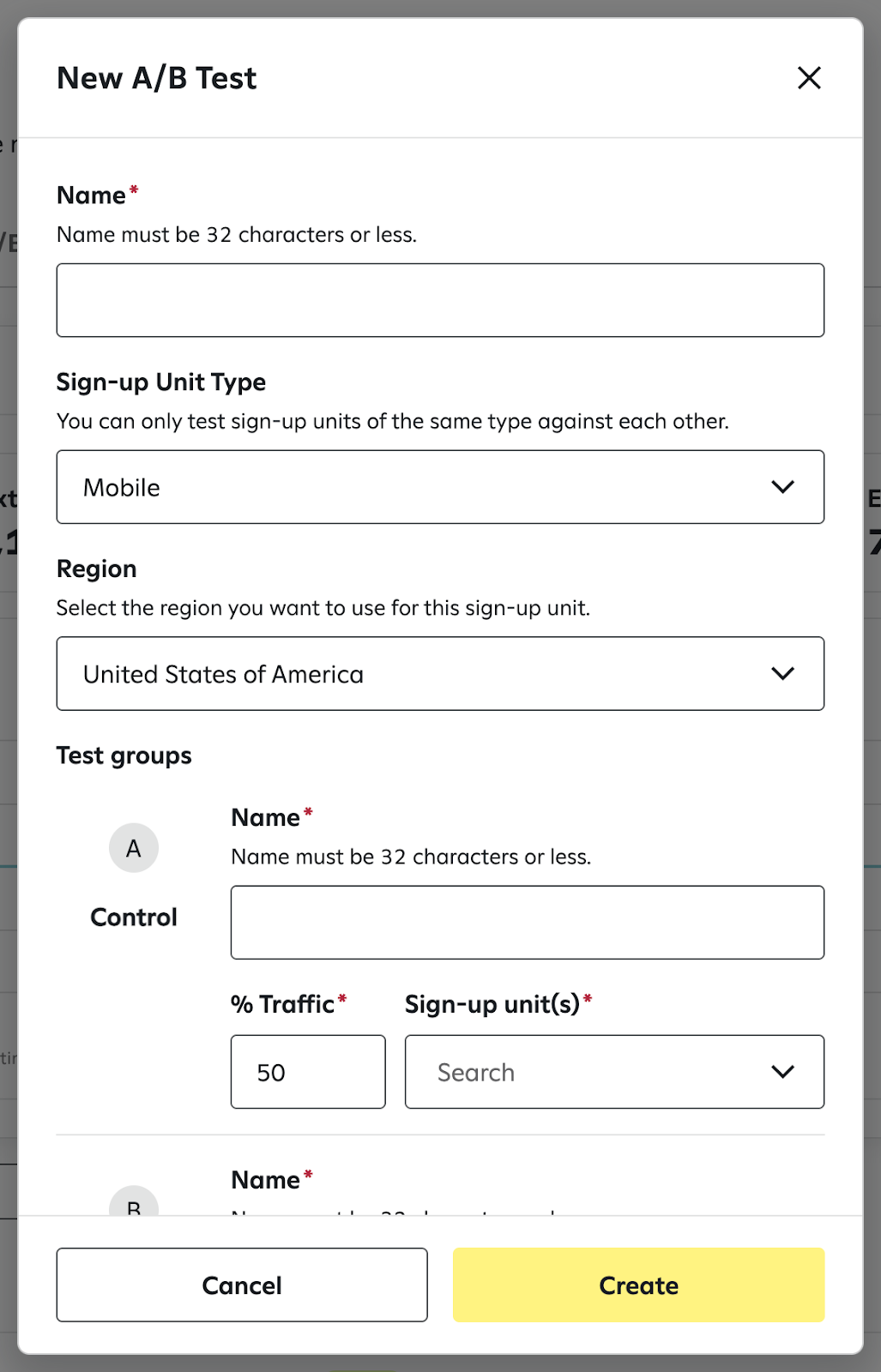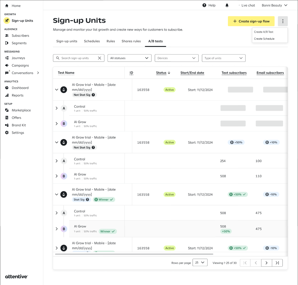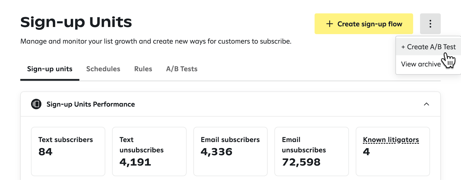 To make running sign-up unit A/B tests more flexible and convenient, you can schedule A/B tests. This feature is currently in open beta. For access, please reach out to your CSM.