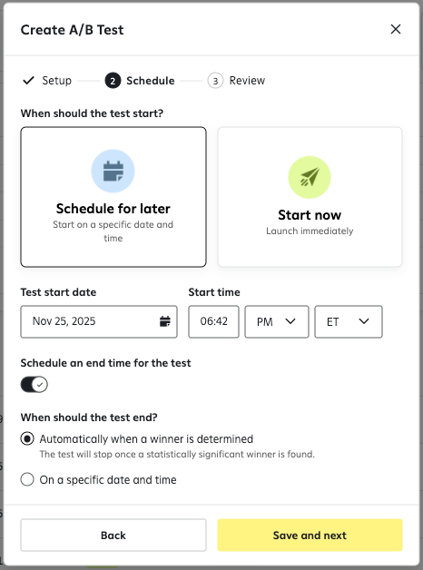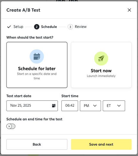 - Schedule when an A/B test starts: Instead of launching immediately, you can pick a specific start date and time for the test.