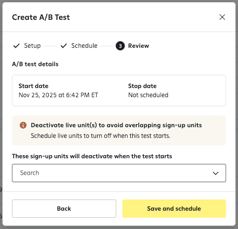 - Optionally deactivate existing sign-up units that might otherwise conflict with the test when it begins — helps prevent overlapping or conflicting display rules. (Note: you could also manage this separately via Sign-up Unit Schedules; scheduling during A/B test setup just makes it more convenient.)