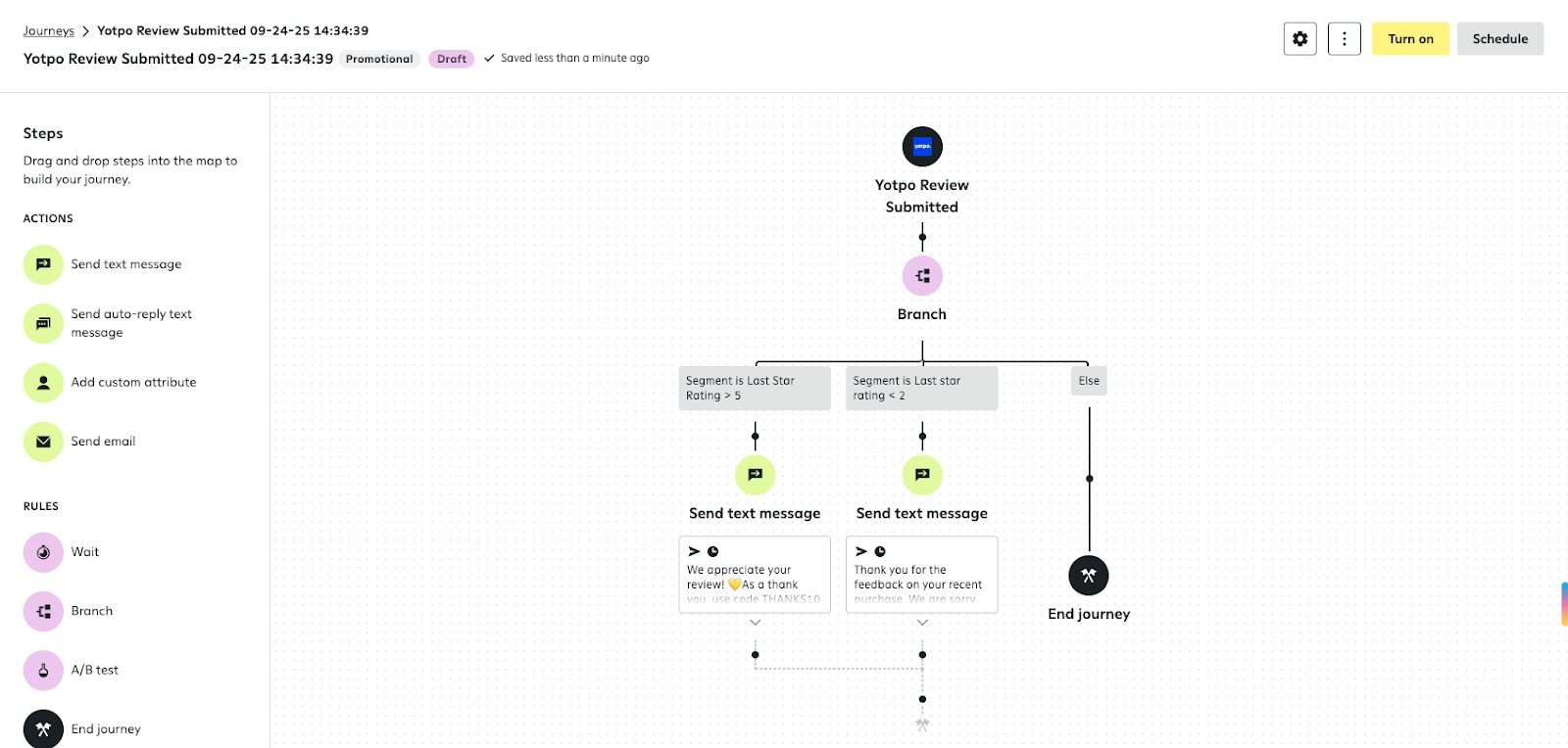 You can then build out your journey. For example, you can send a thank you SMS after a 5-star review or trigger a support journey after a 1-star review.