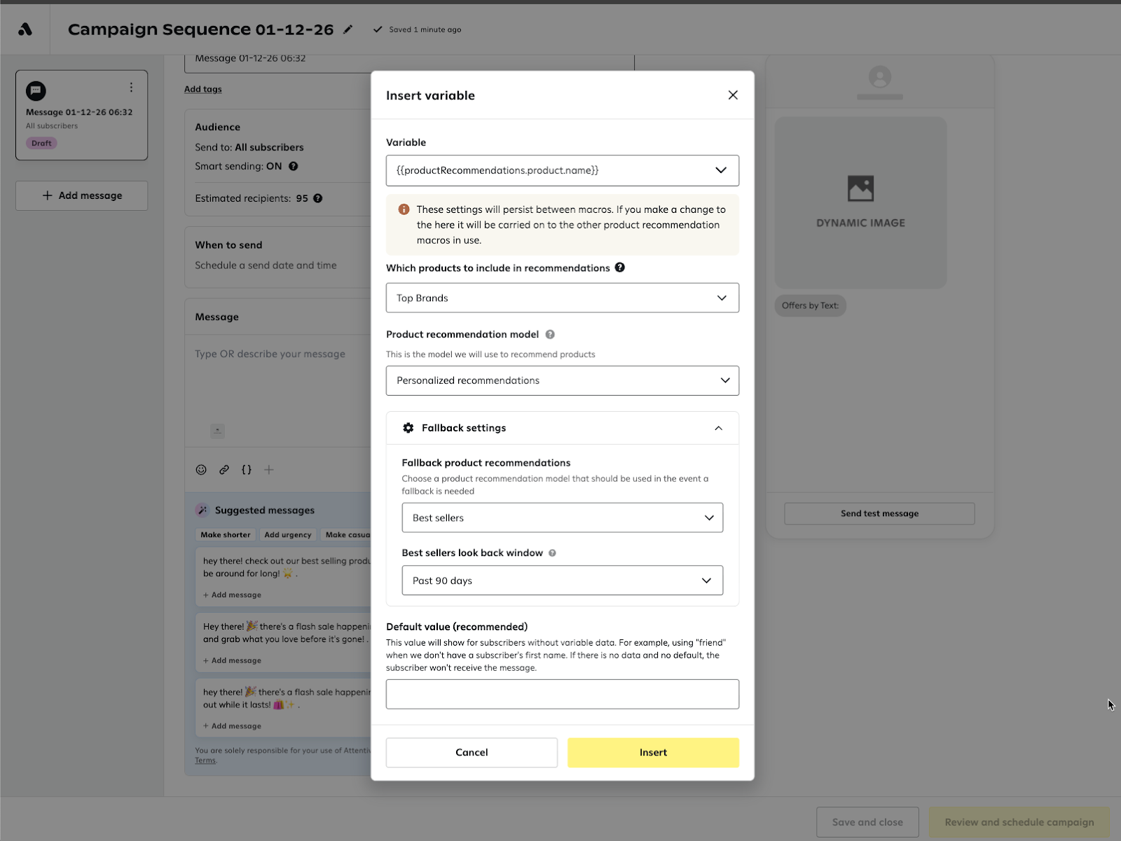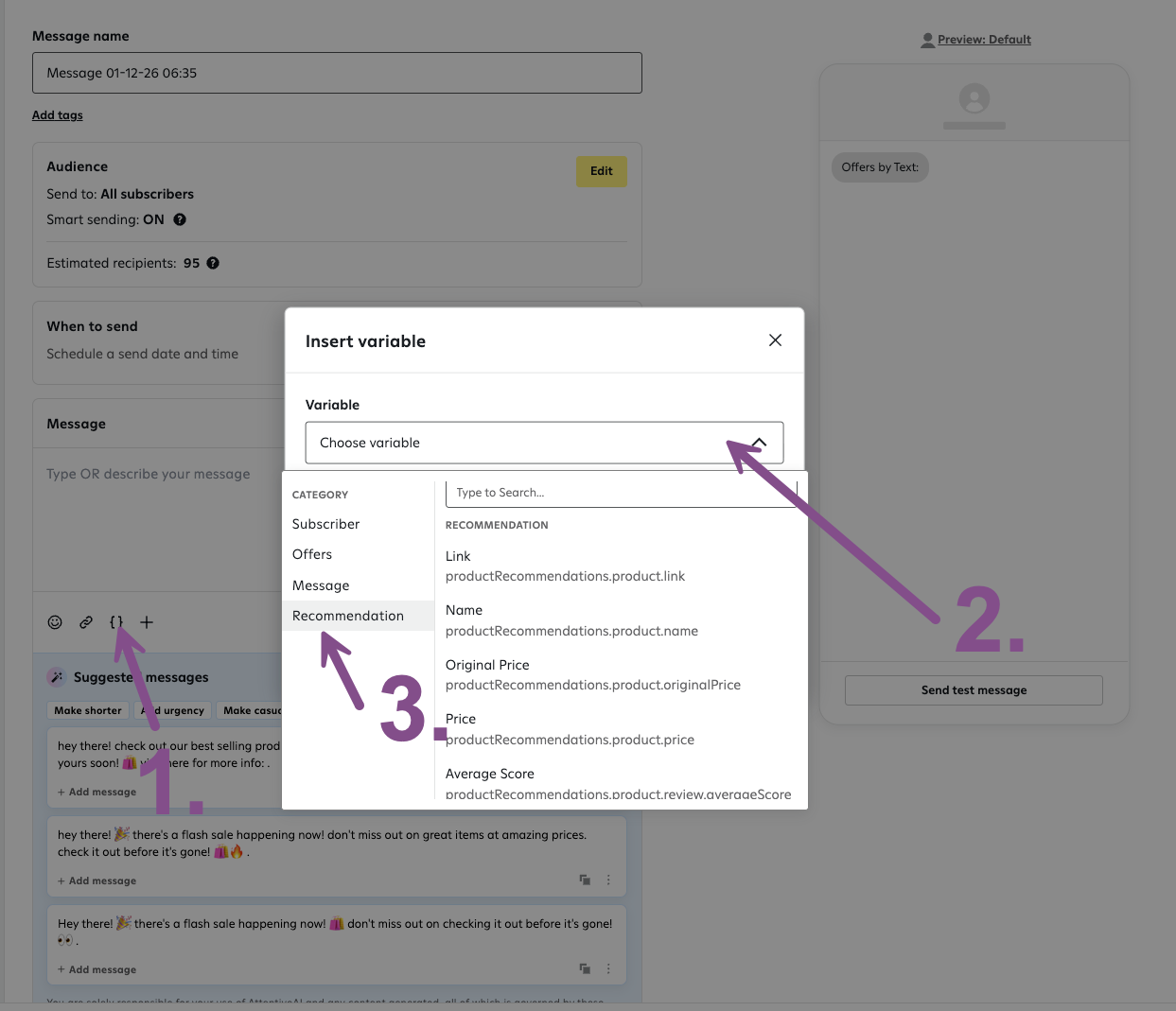 - Insert Variable: Click the "{ }" icon and select Recommendation to insert the product data.