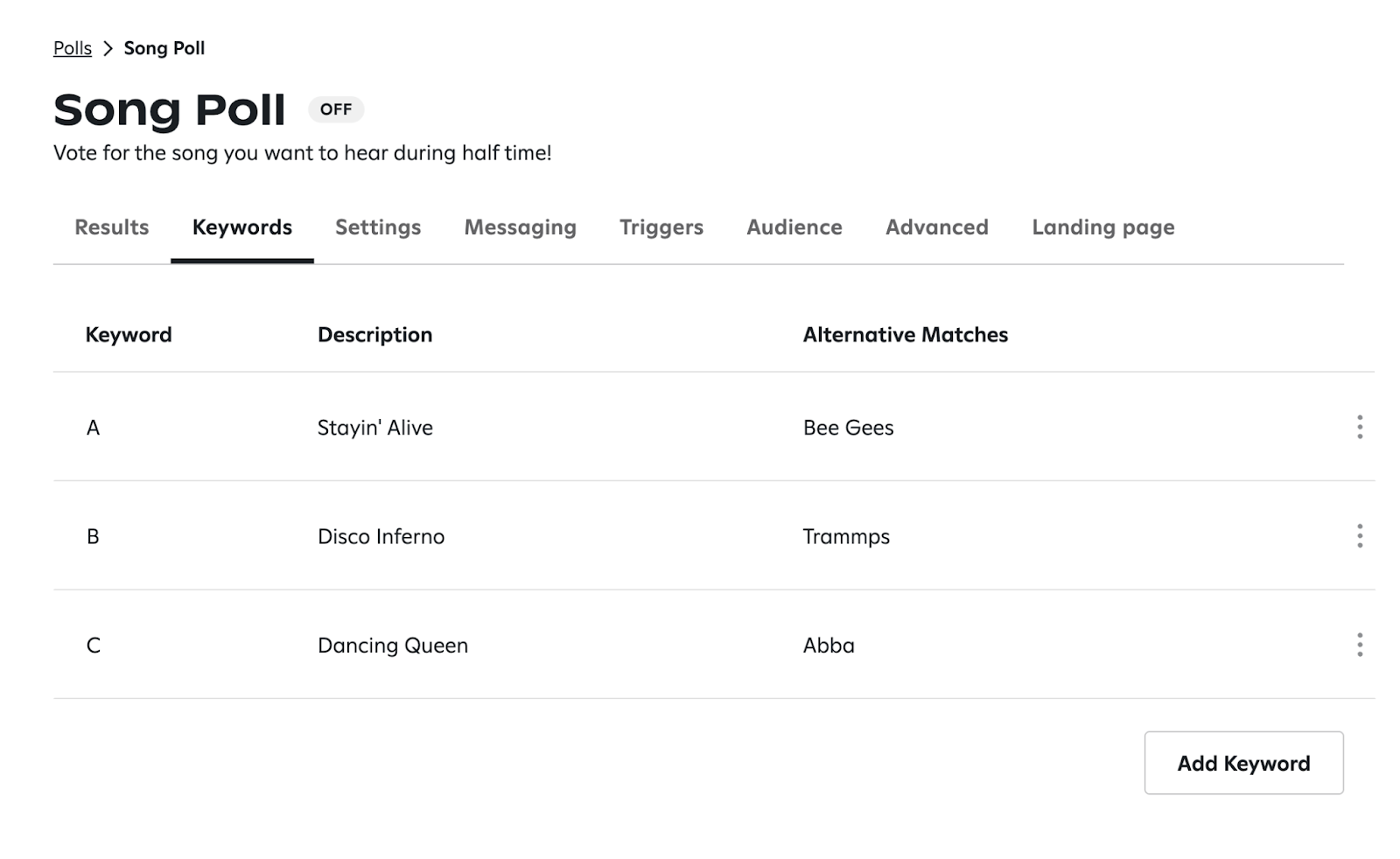 - Clone Poll - Duplicates a poll, retaining its keywords, settings, messaging triggers, and landing page.