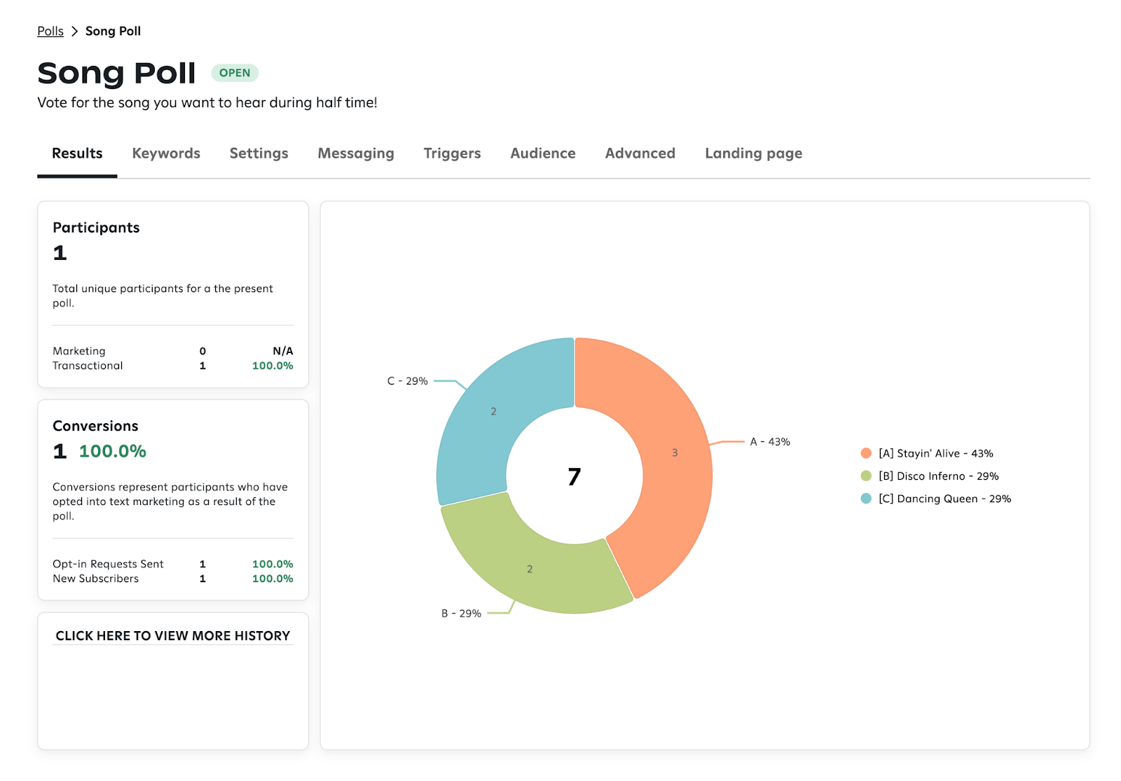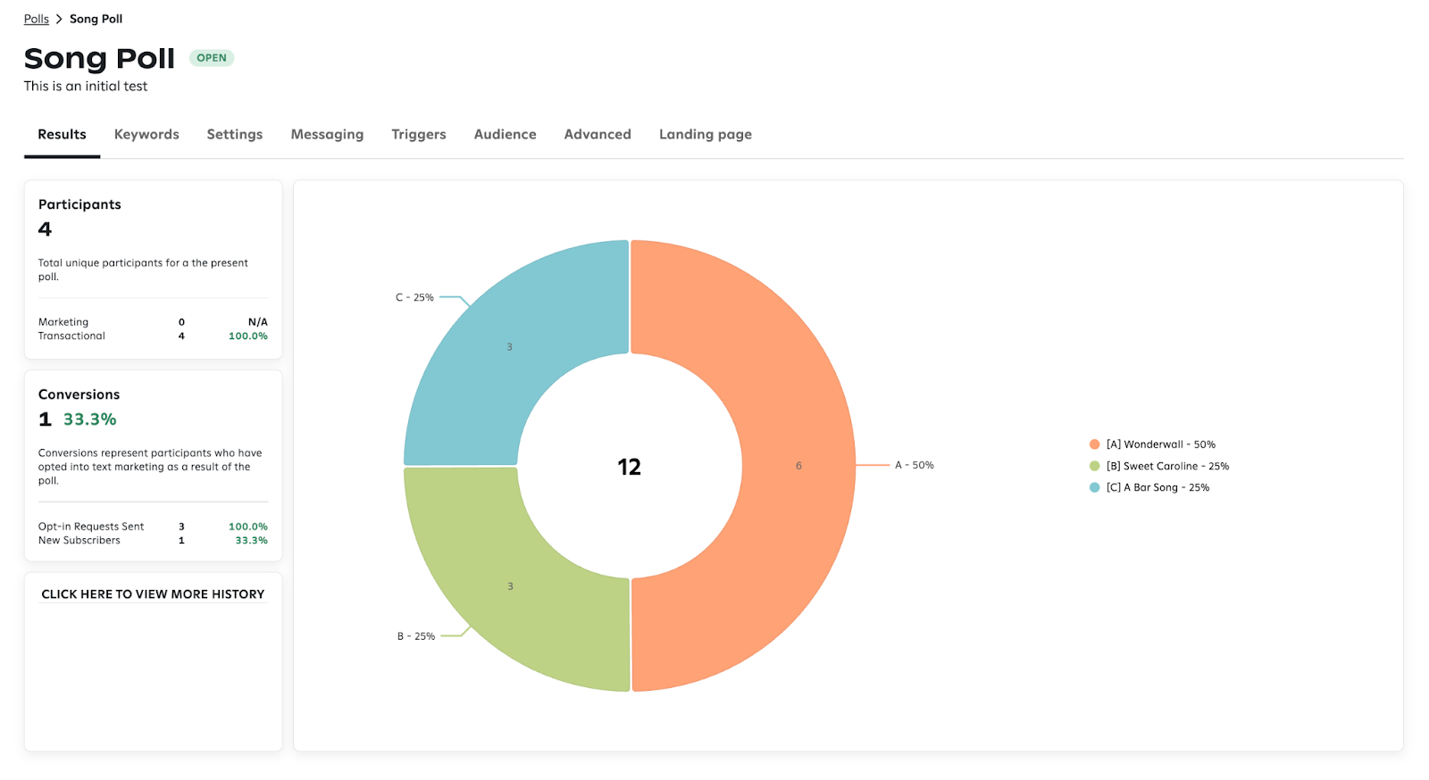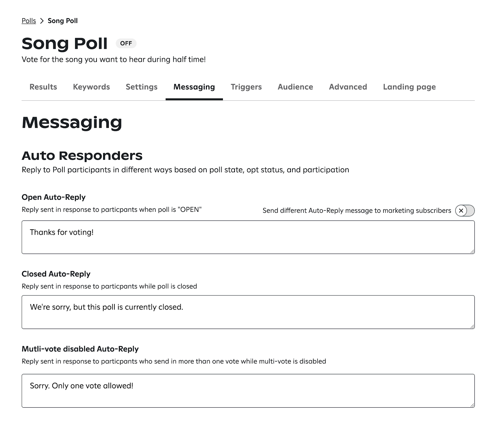 - Open Auto-Reply - reply sent when a fan texts a matching keyword and the poll is OPEN.