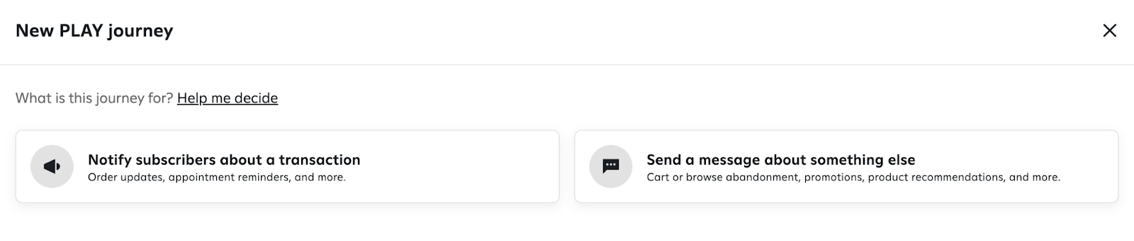 NOTE: Transactional messages have strict requirements and cannot include any promotional content material. Reach out to your legal council or CSM for guidance on what these messages can include. - Send a message about something else - Allows users who were existing subscribers to be entered to the Journey. If you are distributing a prize to new and existing subscribers, it is recommended you also add the incentive to the Welcome Journey for new subscribers.