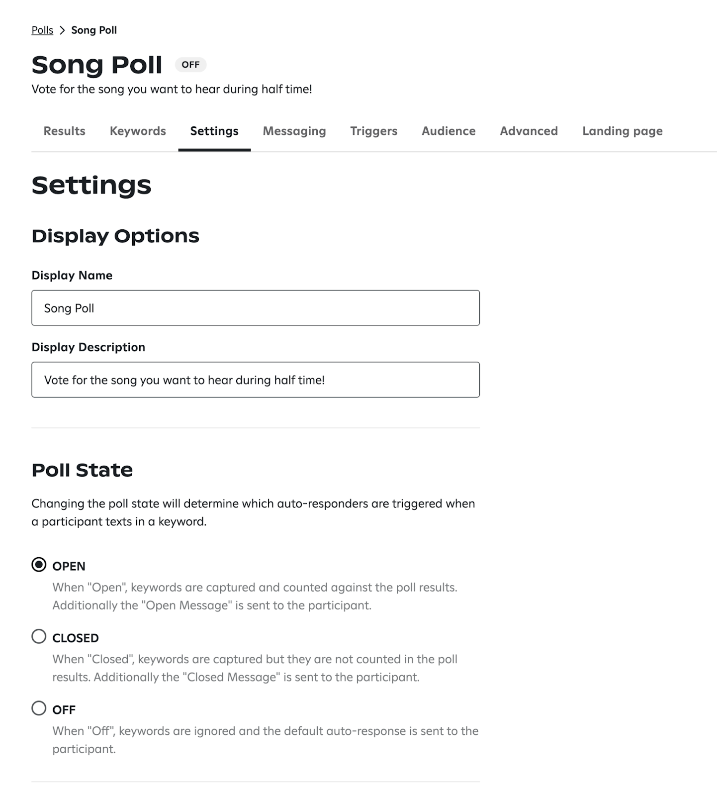 Click the Settings tab, then change the Poll State to OPEN and click Save Settings. When a Poll is OPEN, Gametime will listen for incoming messages and send an auto-reply to any matching keywords or alternative matches.