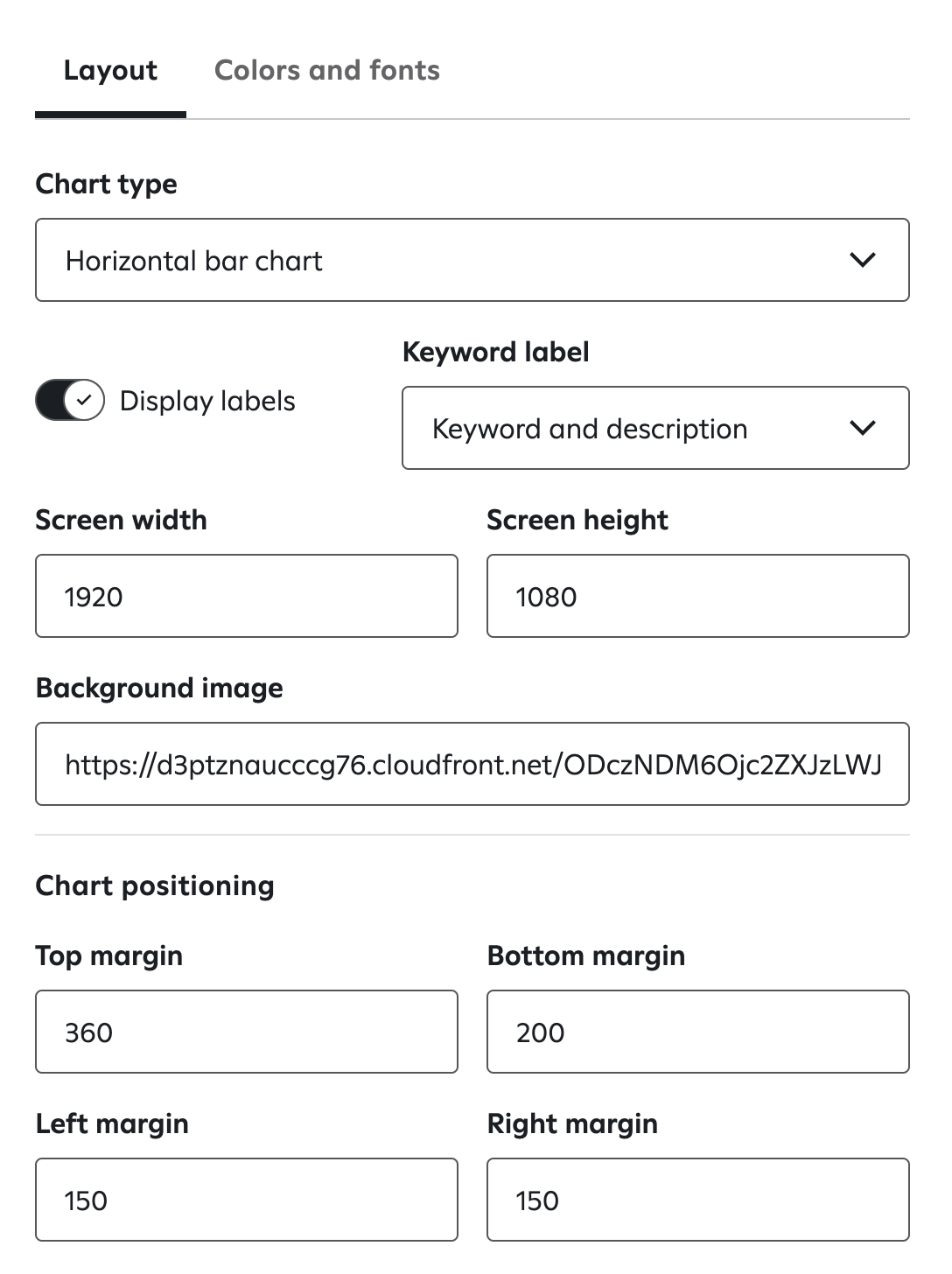 - Font face: The font used for the chart labels. This is read-only. If you want to use a custom font, provide your CSM with the font file.