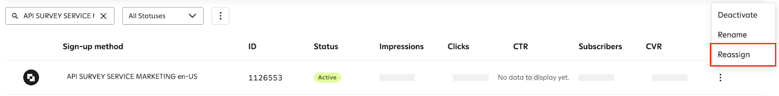 If you select the option to trigger the Default Welcome Journey, Gametime will utilize a default sign-up method called 'API SURVEY SERVICE MARKETING en-US' within the Sign-up Units tab of the UI. This sign up method will trigger the default Welcome Journey. You can change the Welcome Journey associated with this default sign-up method by clicking the contextual menu on the right and choosing 'Reassign'.