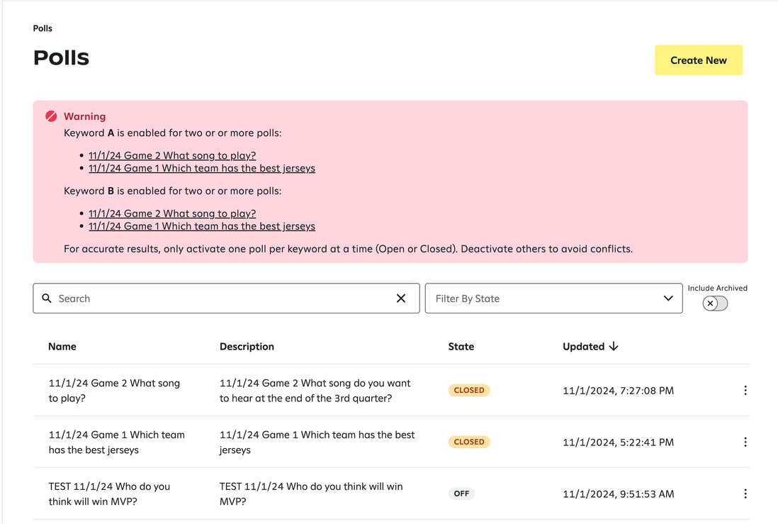 If multiple active polls are using the same keywords, it will lead to unpredictable results. An Active Poll is one that is either OPEN or CLOSED. If you have a scenario where two or more active Polls are using the same keywords, you’ll see a pink banner on the main Polls page informing you of the problem. However, that banner does not appear when viewing an individual poll, so you may be unaware of it when initially enabling a Poll. To solve this, turn one of the polls OFF, or use unique keywords across all active Polls.