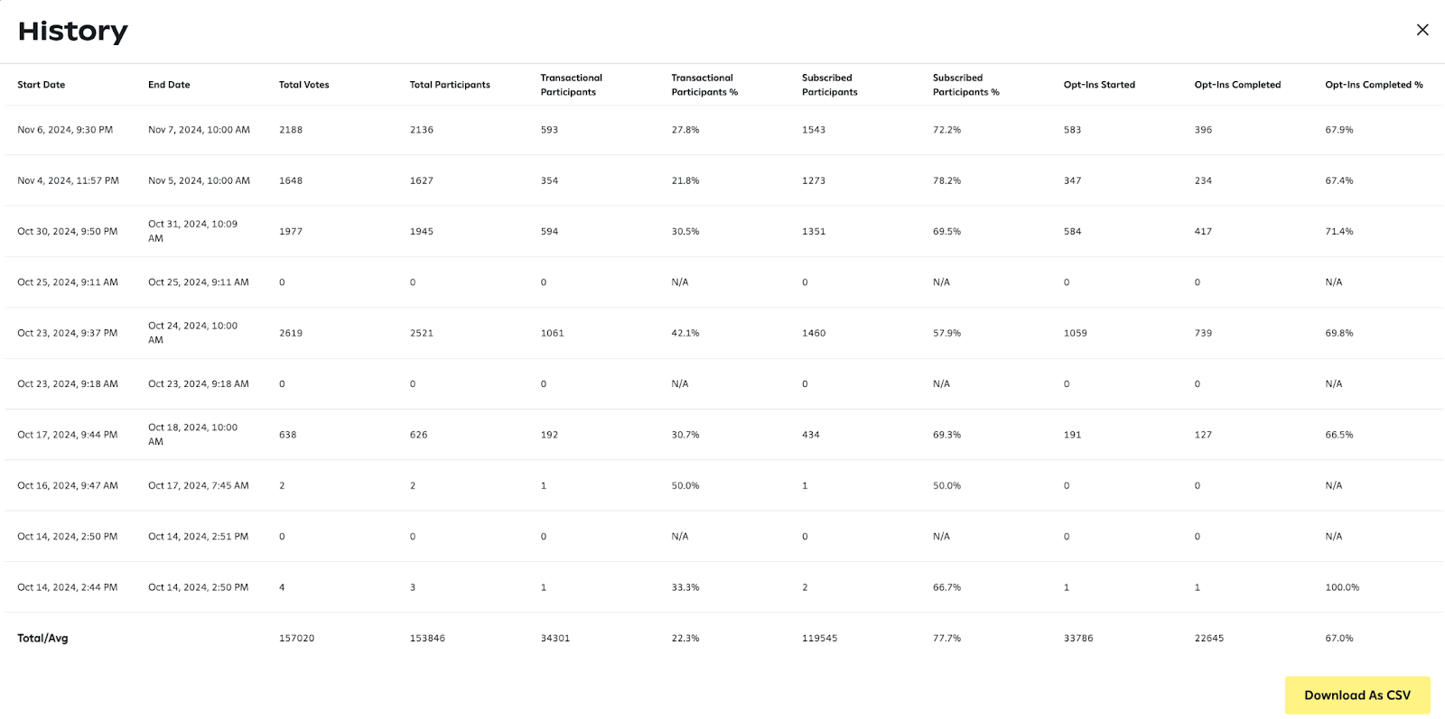 To view past poll results, click 'Click Here To View More History.' You can also download these historical results as a CSV file.