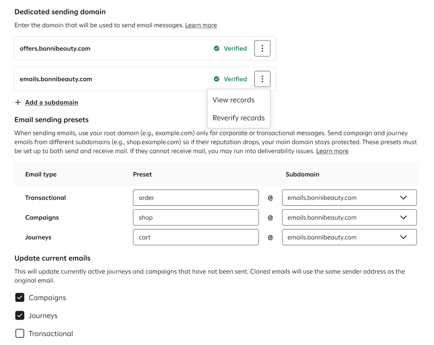 You can also send emails from subdomains (e.g., shop.example.com, cart.example.com). When you're sending emails, we recommend reserving your root domain (e.g., example.com) for corporate or transactional communications. Use subdomains (e.g., support.example.com) for other types of communications, like campaign emails. This way, if your sender reputation score for campaign emails drops, the reputation of your root domain remains unaffected. Once you have added your subdomains, use the Default From Address settings to assign them to specific message types (e.g., using a 'support' subdomain for Transactional emails).