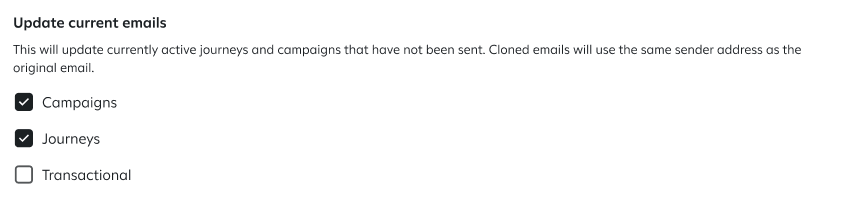 When you update your default 'from' address settings, you can choose whether to apply those changes to existing emails or only to new emails you create going forward.