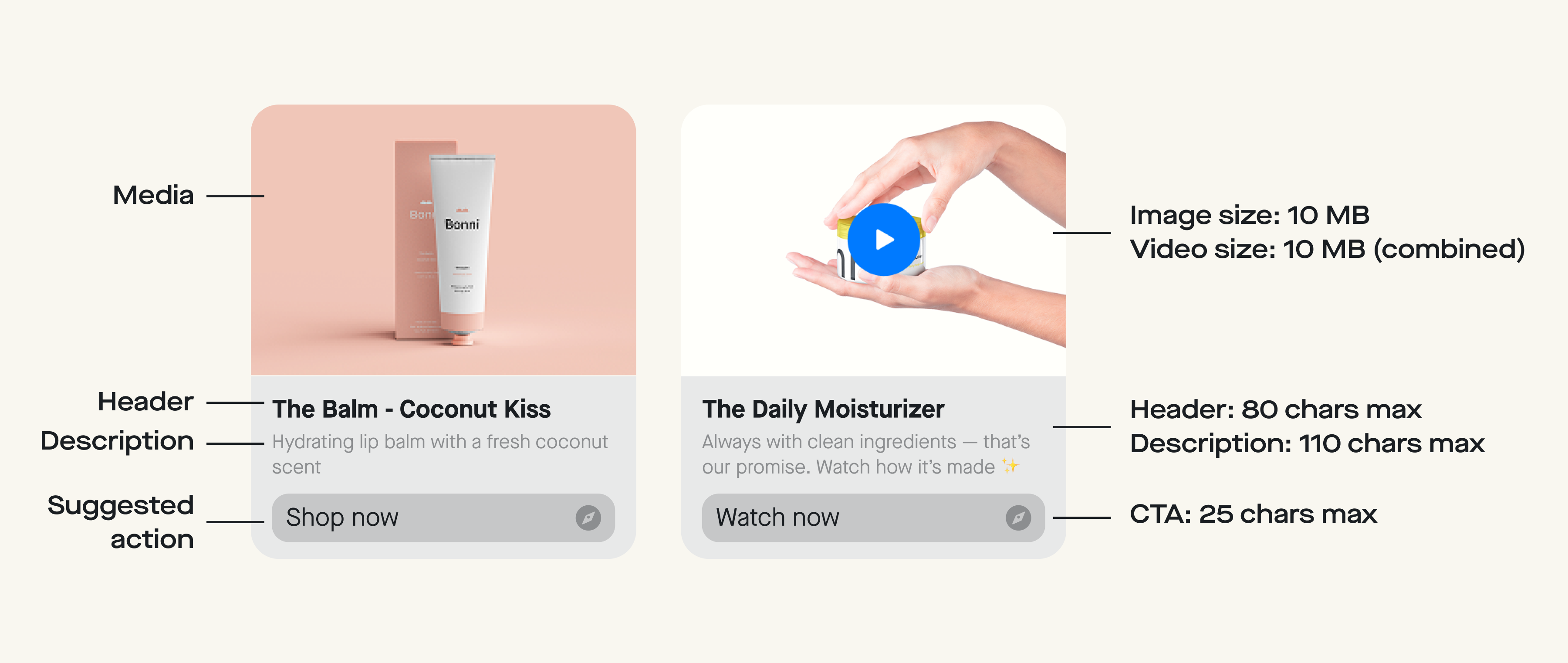 Media: Media is a fantastic way to show off the product/promotion you’re looking to highlight to your audience. We recommend not including text in media due to both accessibility limitations, and media scaling across devices causing text to not display properly.