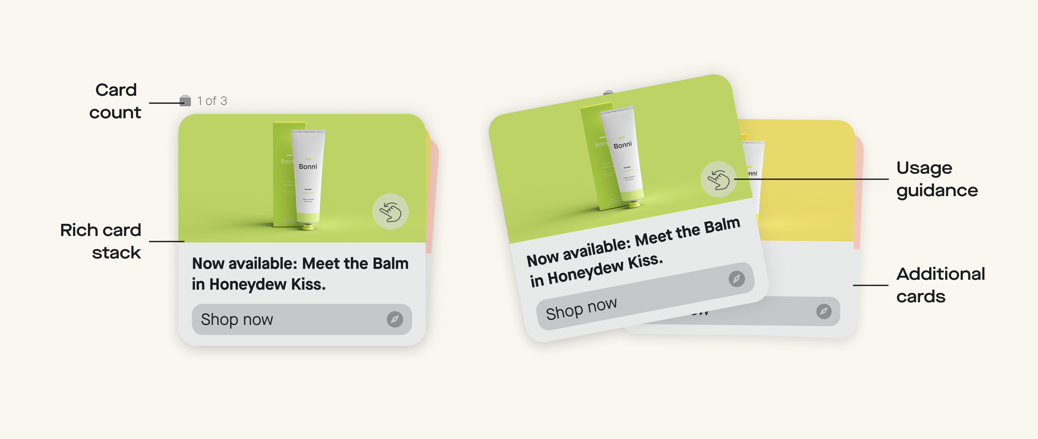 Carousels unlock a way to promote multiple products simultaneously in one “Rich Card Stack.” Since Carousels are essentially Rich Cards stacked on top of each other, they support the same media types, but have specific limitations around file sizing (see below).