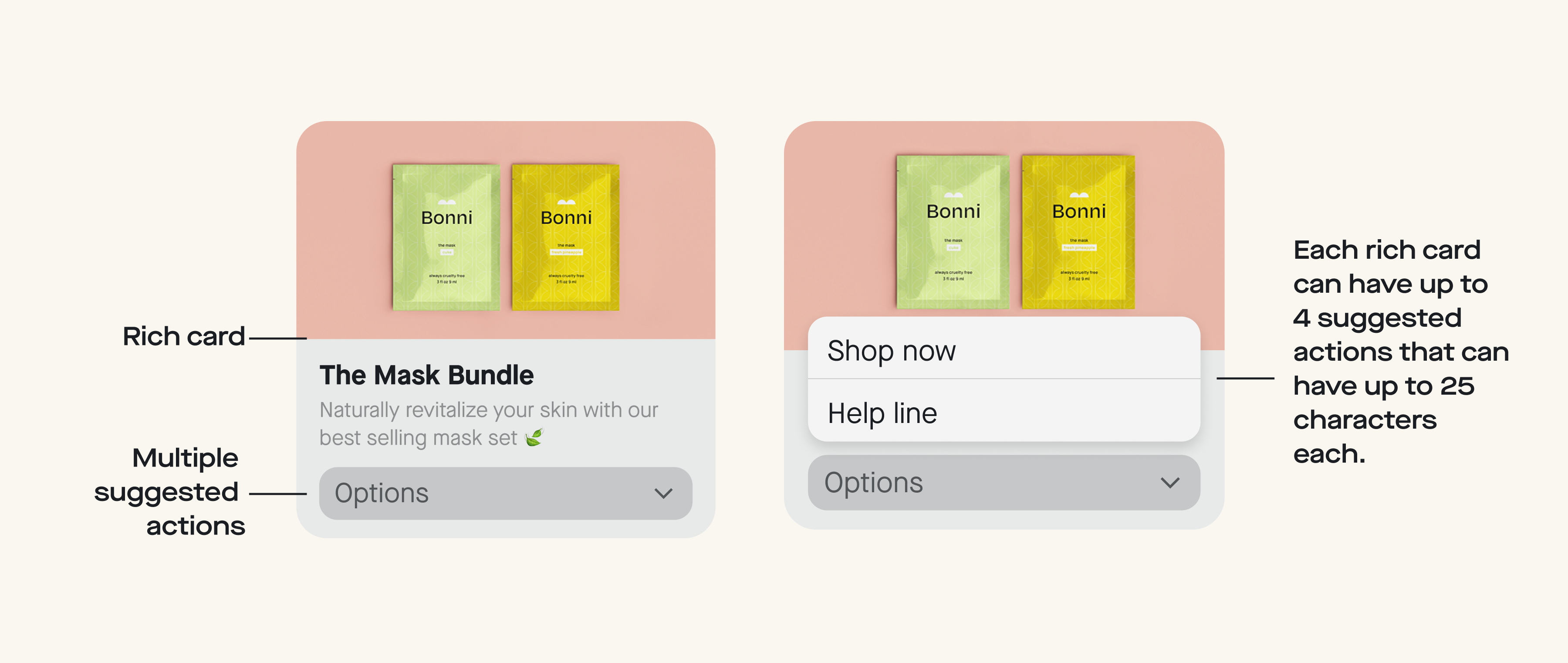 Suggested actions are clickable buttons, either embedded in the rich media card or displayed separately, that make it easy for users to choose either one, or from multiple CTAs.